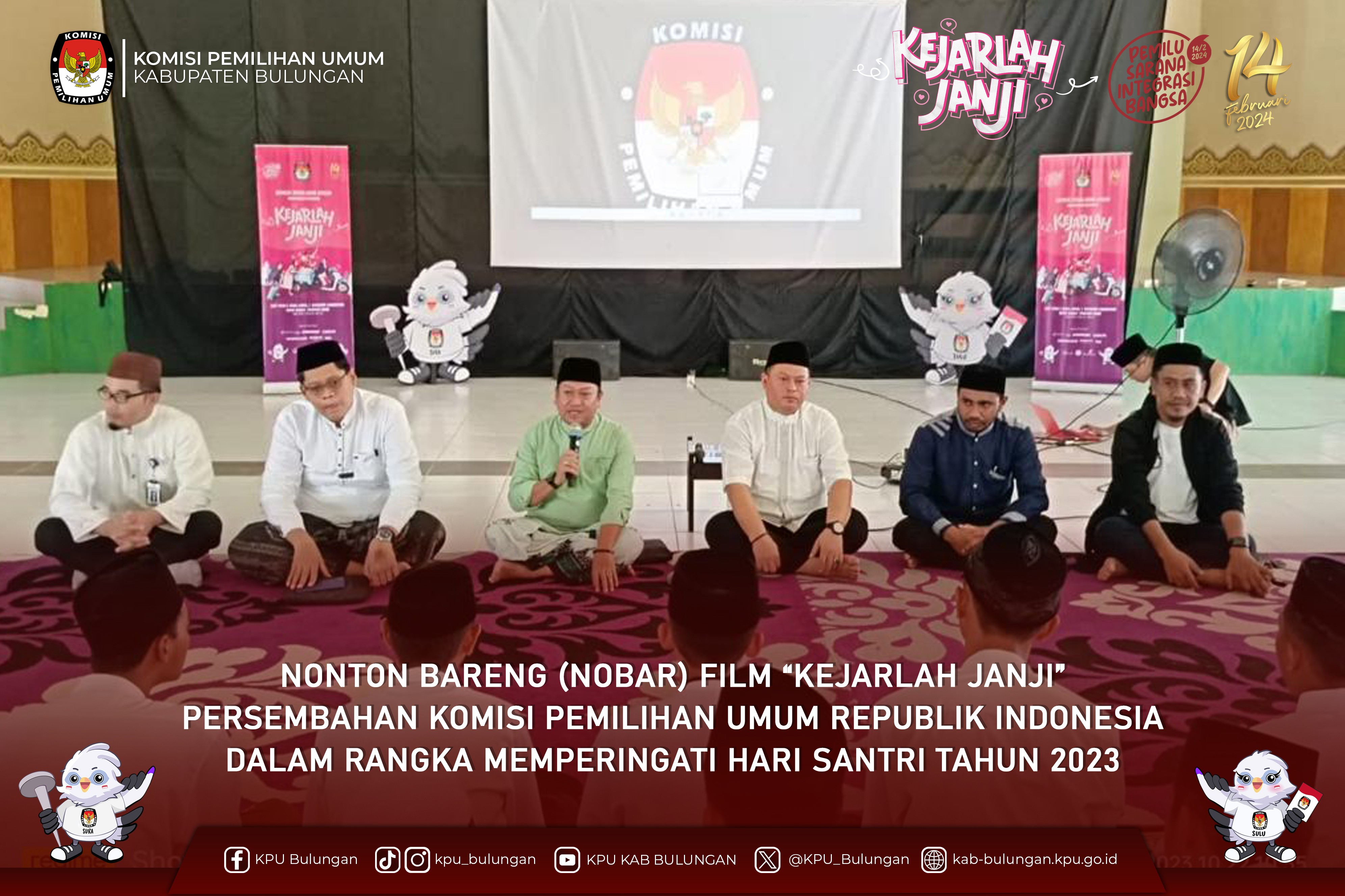 KPU Kab. Bulungan telah melaksanakan kegiatan nonton bareng (Nobar) film "Kejarlah Janji" persembahan Komisi Pemilihan Umum Republik Indonesia dalam rangka Memperingati Hari Santri Tahun 2023 (22/10/2023). Sesuai Peraturan Komisi Pemilihan Umum Nomor 9 Tahun 2022 tentang partisipasi masyarakat dalam Pemilihan Umum dan Pemilihan Gubernur, Bupati dan Wakil Bupati dan/atau Walikota dan Wakil Walikota, bahwa partisispasi masyarakat dapat dilakukan oleh kelompok berbentuk badan hukum ataupun non badan hukum yang diantaranya meliputi organisasi kemasyarakatan, organisasi masyarakat sipil, lembaga pendidikan dan media. Dalam rangka melaksanakan ketentuan Pasal 18 Undang-undang Nomor 7 tahun 2017 tentang Pemilihan Umum yang mengatur tentang tugas dari Komisi Pemilihan Umum Kabupaten/Kota pada poin j disebutkan bahwa tugas KPU Kabupaten adalah mensosialisasikan Penyelenggaraan Pemilu dan/atau yang berkaitan dengan tugas dan wewenang KPU Kabupaten/Kota kepada masyarakat. Sosialisasi Pemilu adalah proses penyampaian informasi tentang tahapan dan program Penyelenggaraan Pemilu yang dilaksanakan oleh penyelenggara pemilu. Tujuan dari pelaksaan sosialisasi adalah sebagai berikut: menyebarluaskan informasi mengenai tahapan, jadwal dan program Pemilu; meningkatkan pengetahuan, pemahaman dan kesadaran masyarakat tentang hak dan kewajiban dalam Pemilu; meningkatkan partisipasi Pemilih dalam Pemilu Pemilih pemula adalah pemilih yang baru pertama kali akan menggunakan hak suaranya dalam penyelenggaraan pemilu. Sedangkan pemilih muda adalah pemilih yang berusia sekitar 17 – 40 tahun. Dilihat dari rentang usia pemilih muda bisa dikategorikan dalam kelompok milenial. Jumlah pemilih muda sekitar 107 juta orang atau 53-55% dari jumlah pemilih pada Pemilu Tahun 2024. Jumlah ini sangat potensial dalam upaya-upaya peningkatan partisipasi masyarakat dalam penyelenggaraan pemilu tahun 2024. Dalam menyasar sasaran pemilih pemula dan pemilih muda, maka perguruan tinggi dan pesantren menjadi kelompok strategis dalam peningkatan partisipasi masyarakat dalam penyelenggaraan pemilu tahun 2024. Untuk itu Komisi Pemilihan Umum menyelenggarakan kegiatan Nonton Bareng Film Kejarlah Janji yang akan di laksanakan untuk memperingati hari santri serta hari sumpah pemuda. Kegiatan nonton bareng dimulai dengan menyanyikan lagu Indonesia Raya, Jingle Pemilu 2024 dan Hymne Santri. Dilanjutkan dengan pembacaan doa serta sambutan dari Anggota KPU Kabupaten Bulungan Divisi Partisipasi masyarakat dan SDM dan dari Pengurus Pesantren Al Khairat serta di kegiatan buka oleh Ketua KPU Provinsi Kalimantan Utara Bapak Suryanatan Al Islami. Kegiatan juga diisi dengan penyerahan piagam penghargaan kepada pengurus pesantren Al Khairat dan dilanjutkan dengan menyaksikan/nonton bareng film kejarlah janji. Adapun peserta kegiatan nonton bareng film kejarlah janjiku memperingati hari snatri adalah: Ketua KPU Provinsi Kalimantan Utara Anggota KPU Kabupaten Bulungan Ketua Bawaslu Kabupaten Bulungan Pengurus pesantren Al Khairat Santri pesantren Al Khairat Staf sekretariat KPU Kabupaten Bulungan sebagai panitia kegiatan Kegiatan di tutup pada pukul 16.30 wita dikarenakan pada saat pelaksanaan kegiatan nonton bareng terjadi pemadaman listrik yang diakibatkan cuaca yang buruk. Kegiatan dilanjutkan kembali pada pukul 13.00 wita dan berakhir pada pukul 15.30 wita. #KPUMelayani #PemiluSerentak2024