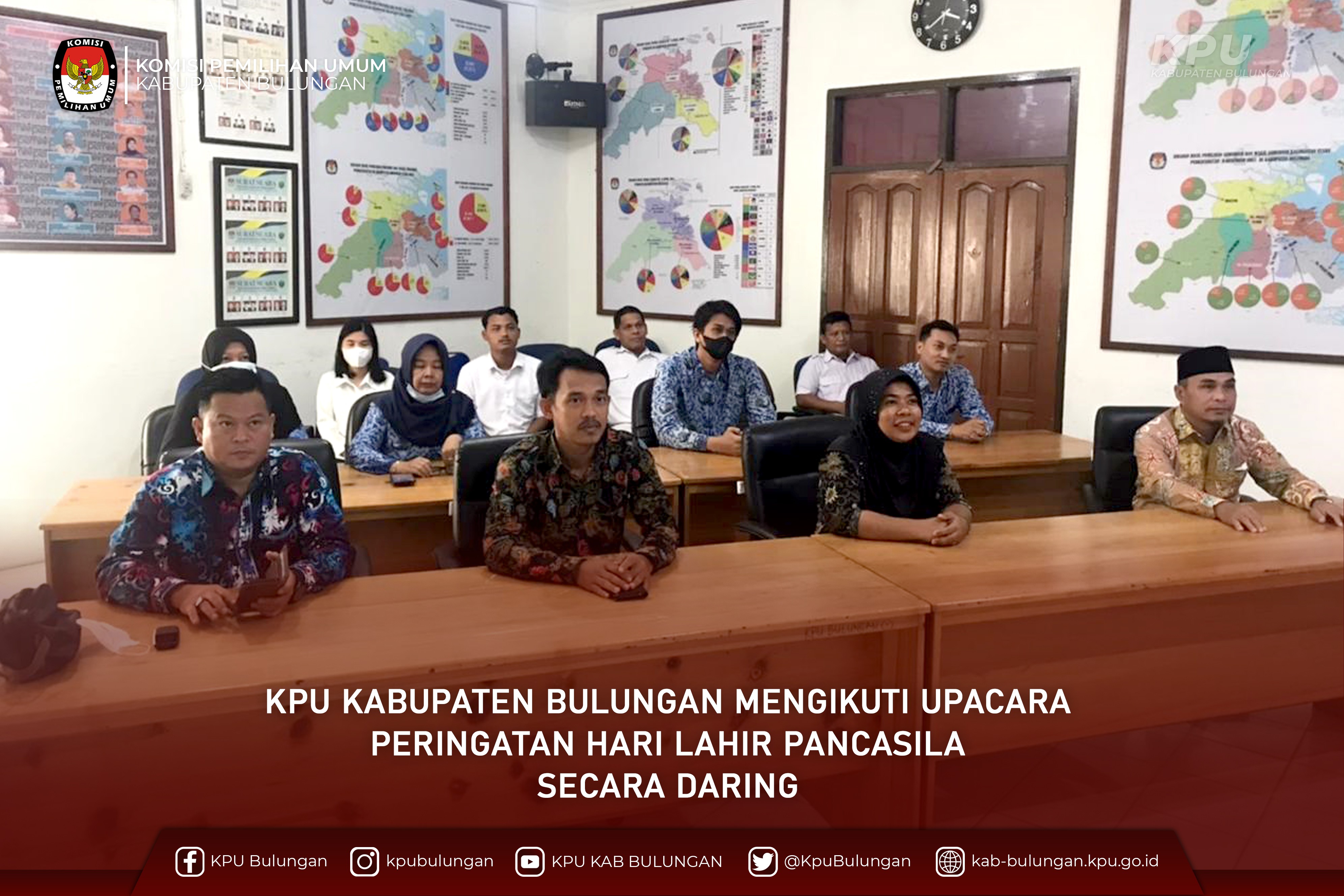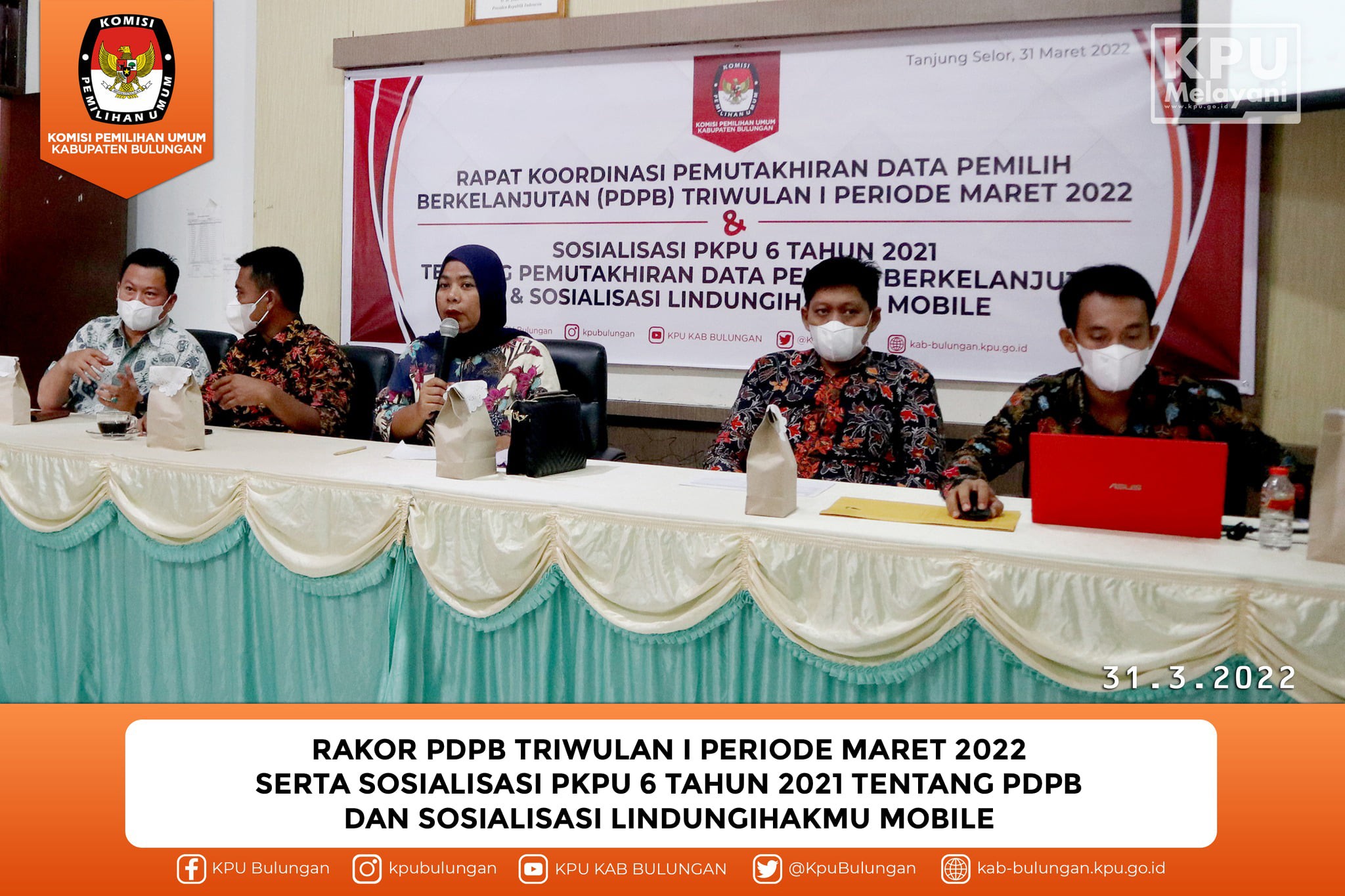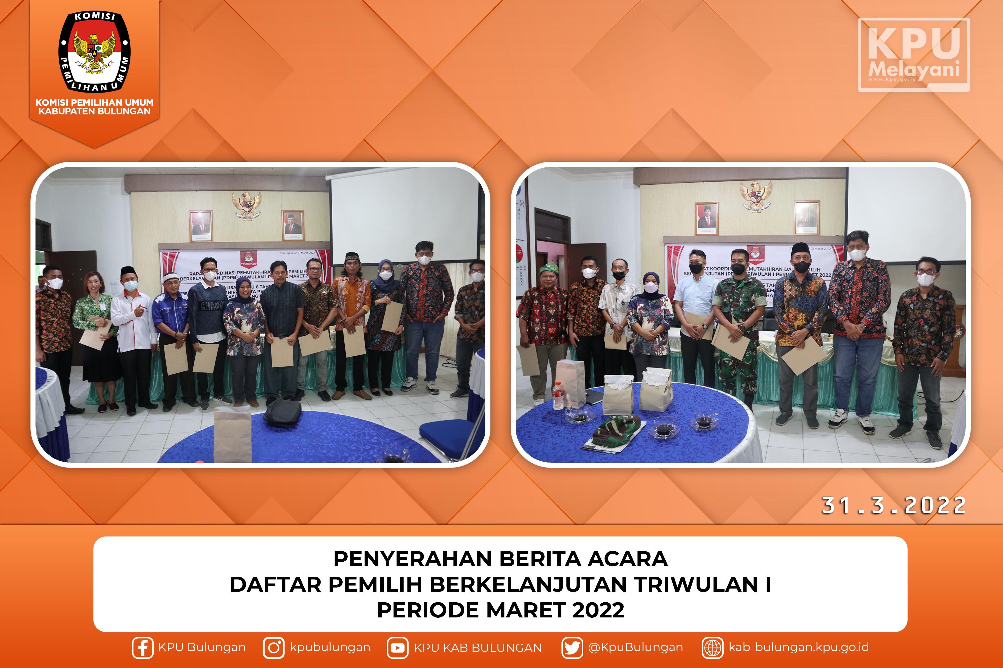 KPU Kab. Bulungan Menyerahkan Berita Acara Daftar Pemilih Berkelanjutan Triwulan I Periode Maret 2022 kepada Bawaslu Kab. Bulungan, Kesbangpol Kab. Bulungan, Disdukcapil Kab. Bulungan, TNI/Polri, DPMD Kab. Bulungan, Parpol Tingkat Kabupaten Bulungan, Kelurahan Tingkat Kec. Tanjung Selor, dan Ketua RT, Tingkat Kelurahan Tanjung Selor Hilir.