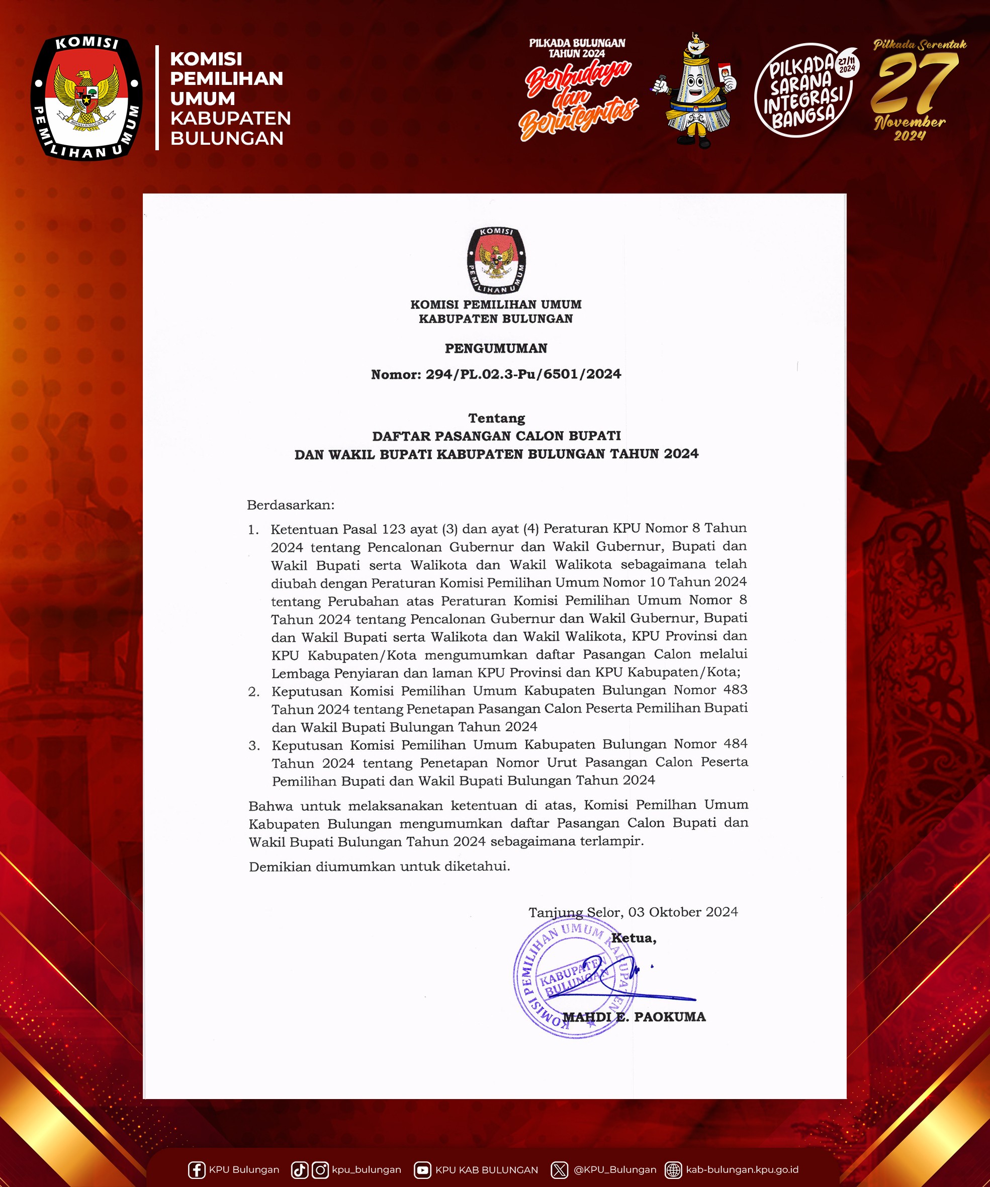 #TemanPemilih Berikut kami sampaikan Pengumuman Nomor: 294/PL.02.3-Pu/6501/2024 Tentang Daftar Pasangan Calon Bupati dan Wakil Bupati Bulungan Tahun 2024.