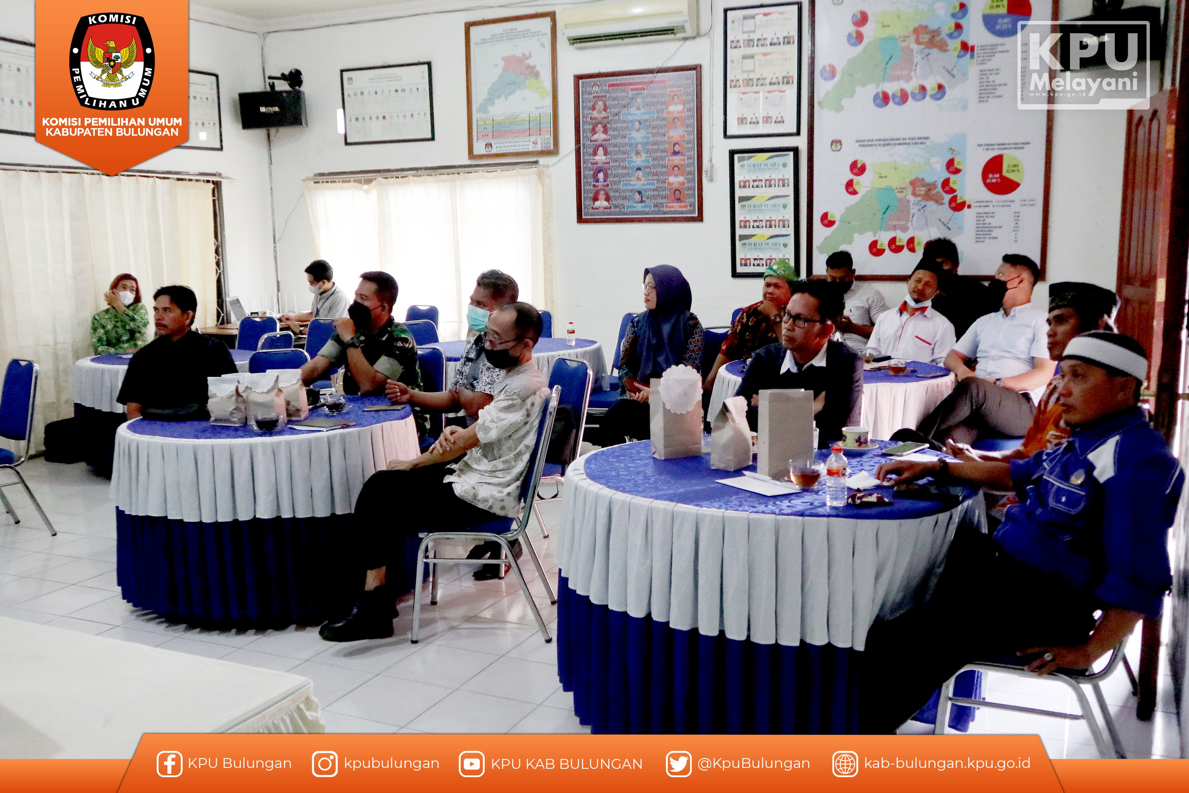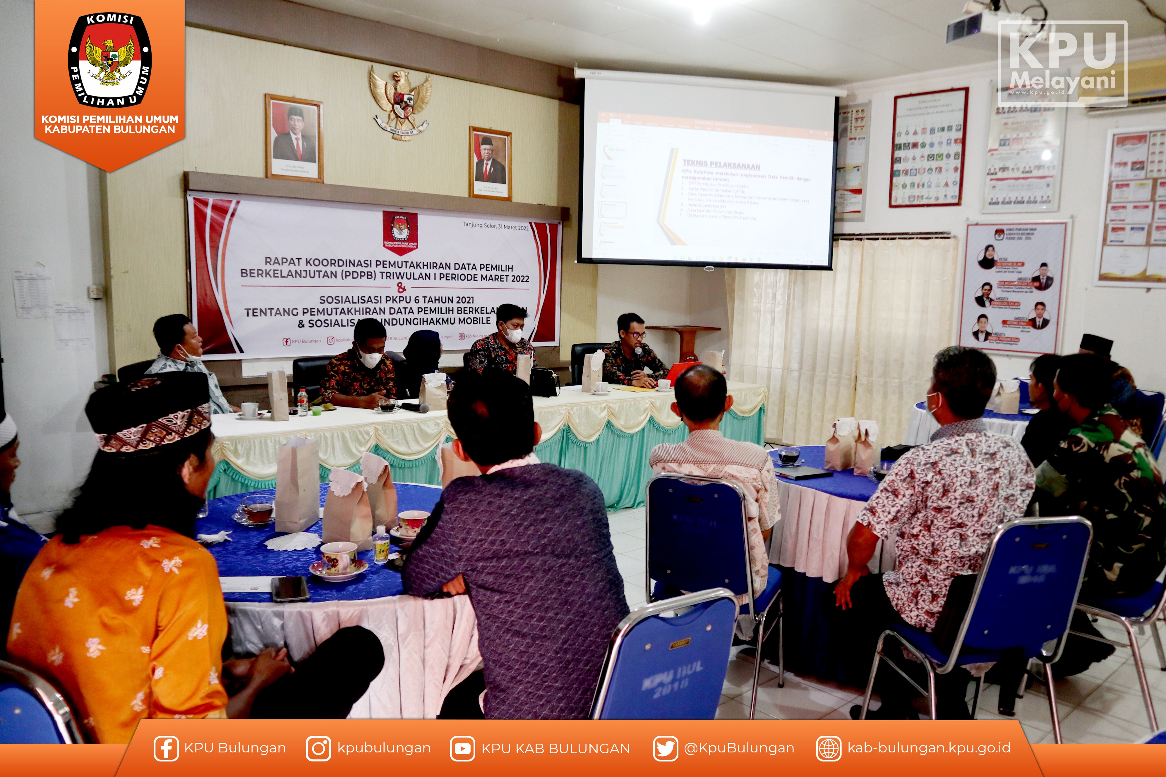 KPU Kab. Bulungan telah melaksanakan Rapat Koordinasi Pemutakhiran Data Pemilih Berkelanjutan (PDPB) Triwulan I Periode Maret 2022 serta Sosialisasi PKPU 6 Tahun 2021 tentang Pemutakhiran Data Pemilih Berkelanjutan (PDPB) dan Sosialisasi LindungiHakMu Mobile yang dihadiri oleh Bawaslu Kab. Bulungan, Kesbangpol Kab. Bulungan, Disdukcapil Kab. Bulungan, TNI/Polri, DPMD Kab. Bulungan, Parpol Tingkat Kabupaten Bulungan, Kelurahan Tingkat Kec. Tanjung Selor, dan Ketua RT Tingkat Kelurahan Tanjung Selor Hilir. Bertempat di Ruang Rapat KPU Kab. Bulungan.