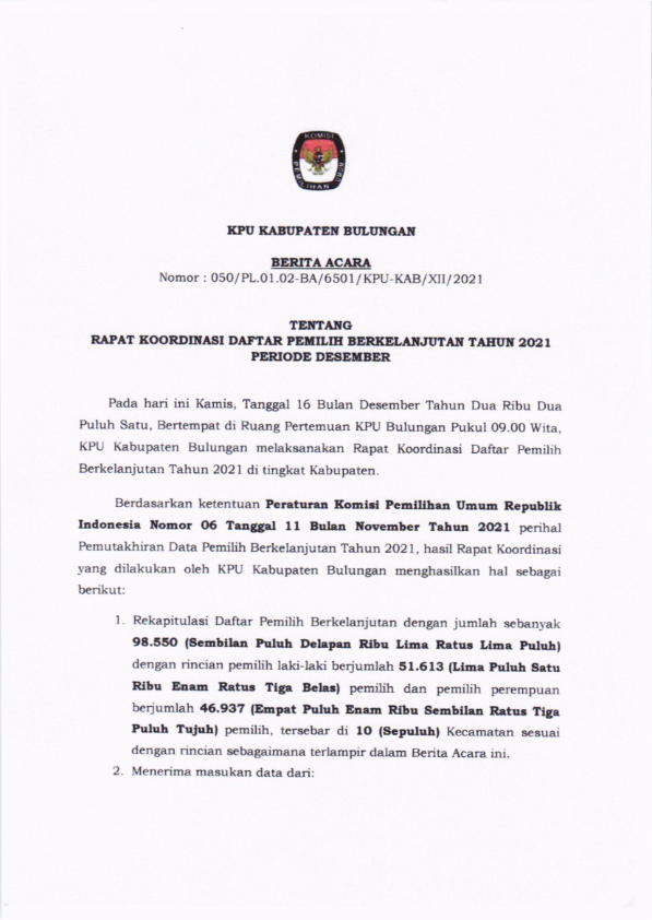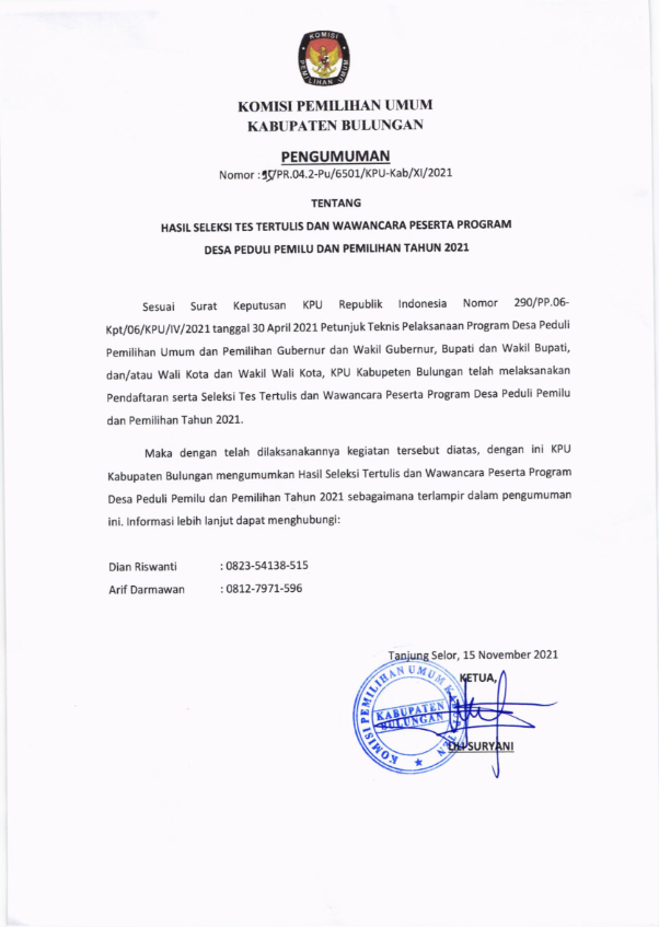 Sesuai Surat Keputusan KPU Republik Indonesia Nomor 290/PP.06-Kpt/06/KPU/IV/2021 Tanggal 30 April 2021 Pentunjuk Teknis Pelaksanaan Program Desa Peduli Pemilihan umum dan Pemilihan Gubernur dan Wakil Gubernur, Bupati dan Wakil Bupati, dan/atau Wali Kota dan Wakil Wali Kota, KPU Kabupaten Bulungan telah melaksanakan Pendaftaran serta Seleksi Tertulis dan Wawancara Peserta Program Desa Peduli Pemilihan Umum dan Pemilihan Tahun 2021